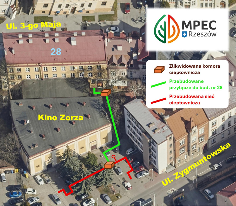 Ważnym elementem inwestycji będzie także wykonanie nowego przyłącza cieplnego do budynku kina Zorza przy ul. 3go Maja 28.