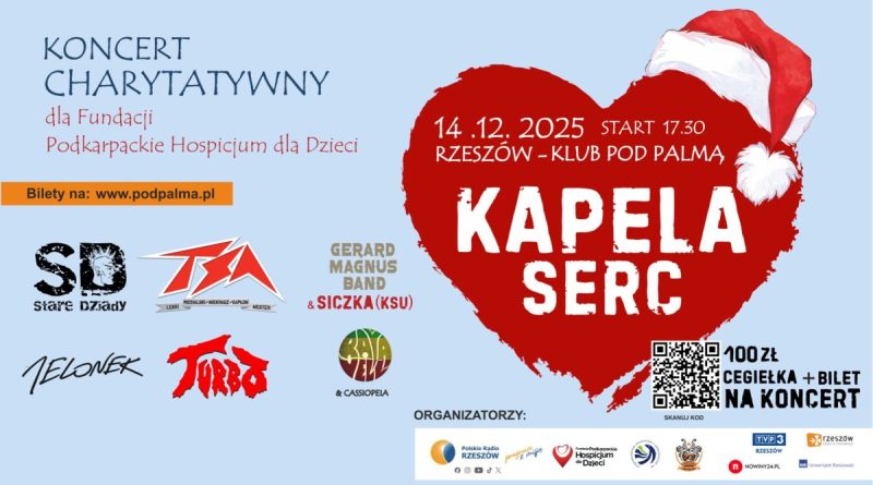 14 grudnia w Klubie Pod Palmą w Rzeszowie odbędzie się absolutnie niezwykły koncert charytatywny „Kapela Serc”. Całkowity dochód zasili Fundację Podkarpackie Hospicjum dla Dzieci w Rzeszowie.