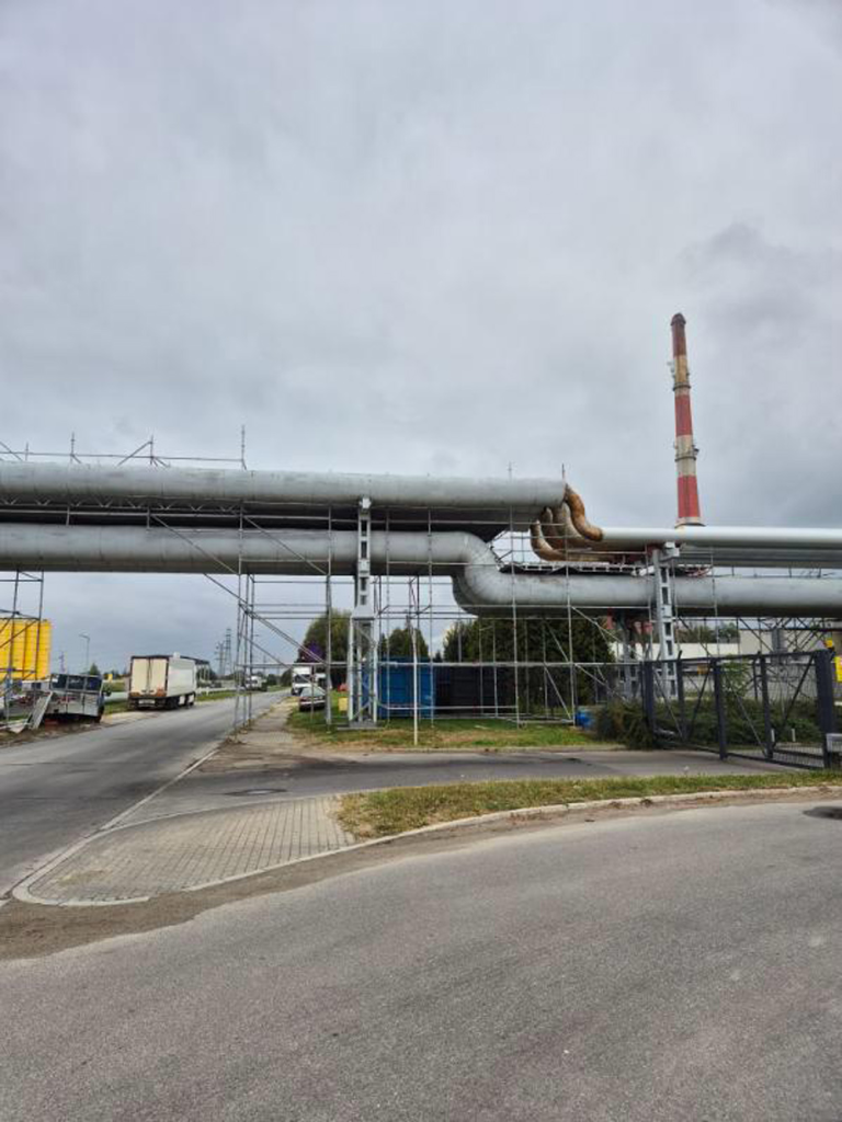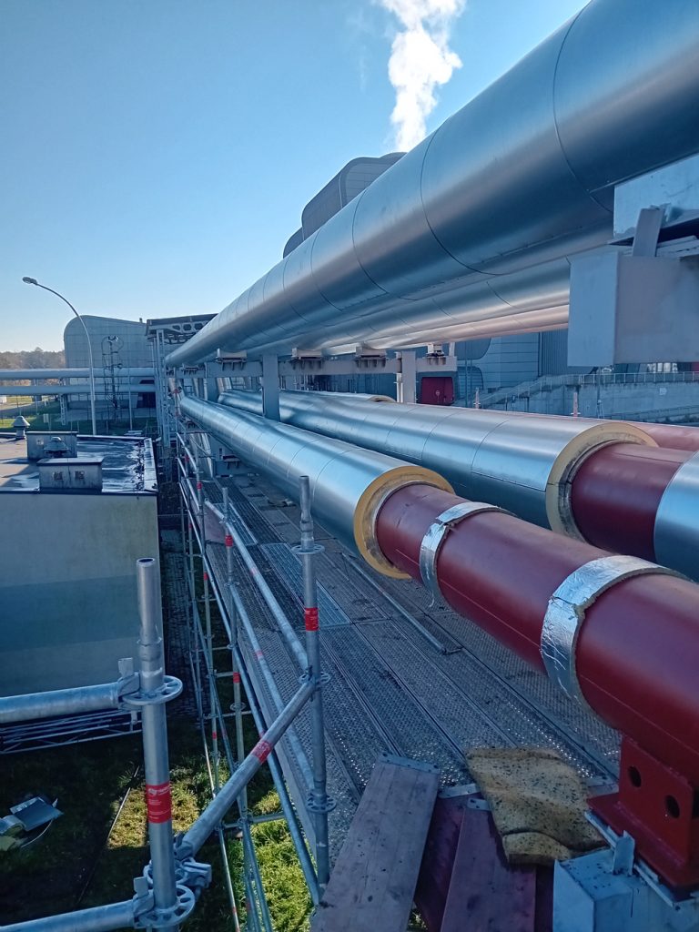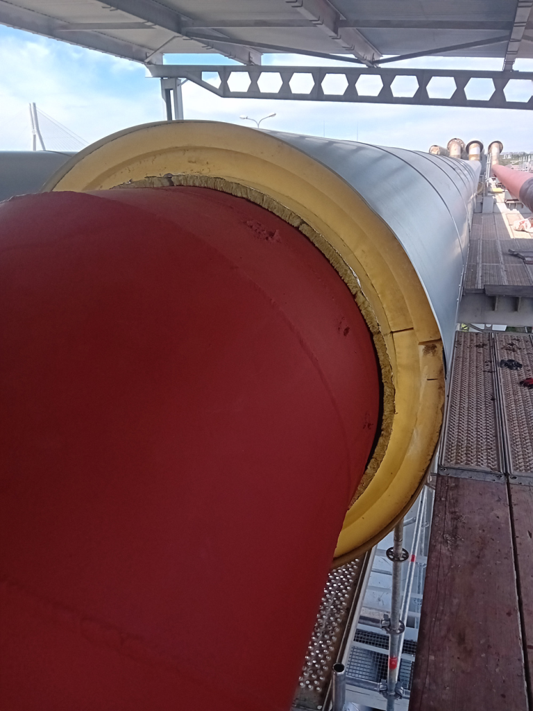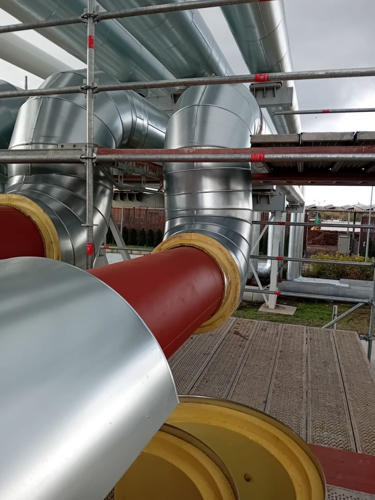 Zakres robót obejmował całkowite usunięcie starej izolacji, wykonanej głównie z wełny mineralnej, która na przestrzeni lat utraciła swoje właściwości termoizolacyjne i była podatna na zawilgocenie. Przed montażem nowej izolacji stalowe rurociągi zostały poddane kontroli technicznej, oczyszczone oraz zabezpieczone powłoką antykorozyjną. Następnie zastosowano nowoczesną izolację z pianki poliuretanowej (PUR) o grubości około 100 mm, w formie prefabrykowanych łupin trwale zespolonych z płaszczem z blachy stalowej. Izolacją objęto zarówno odcinki proste, jak i łuki oraz kolana rurociągów, z wykorzystaniem odpowiednio dopasowanych elementów segmentowych.