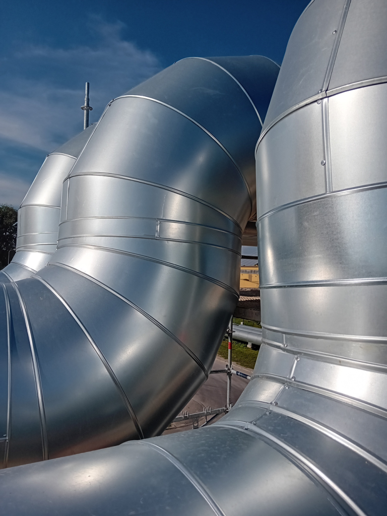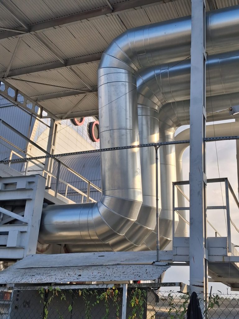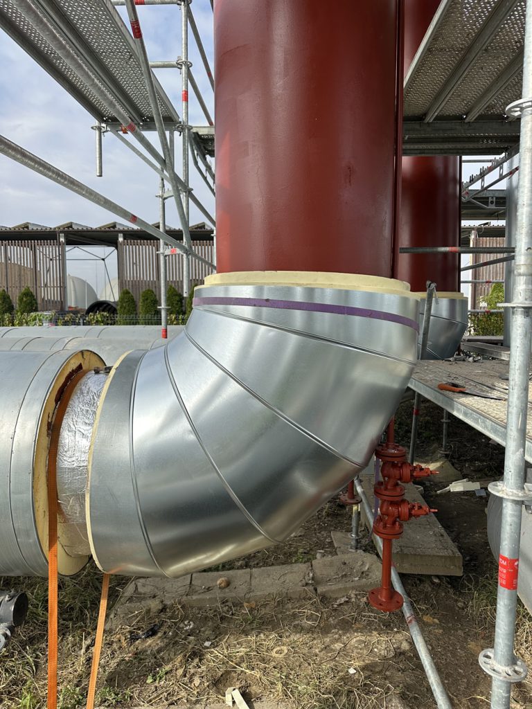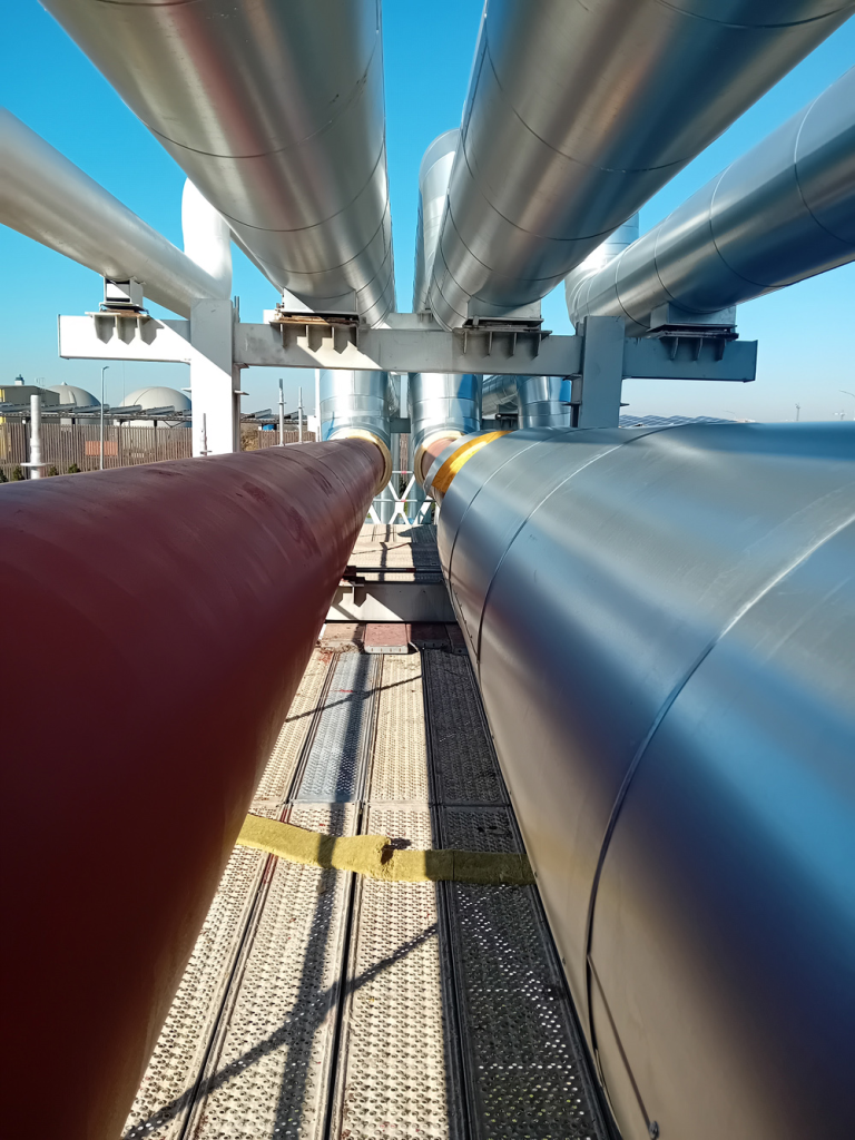Zakres robót obejmował całkowite usunięcie starej izolacji, wykonanej głównie z wełny mineralnej, która na przestrzeni lat utraciła swoje właściwości termoizolacyjne i była podatna na zawilgocenie. Przed montażem nowej izolacji stalowe rurociągi zostały poddane kontroli technicznej, oczyszczone oraz zabezpieczone powłoką antykorozyjną. Następnie zastosowano nowoczesną izolację z pianki poliuretanowej (PUR) o grubości około 100 mm, w formie prefabrykowanych łupin trwale zespolonych z płaszczem z blachy stalowej. Izolacją objęto zarówno odcinki proste, jak i łuki oraz kolana rurociągów, z wykorzystaniem odpowiednio dopasowanych elementów segmentowych.